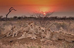 Once lunch was done we placed our orders for dinner and relaxed in the room looking over our deck until the afternoon drive. Here we were surprised by some Little Bee-eaters, a white rhino having a good drink that was joined by an elephant. Our evening finished off with a spectacular sunset and a Giant Eagle Owl.