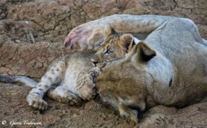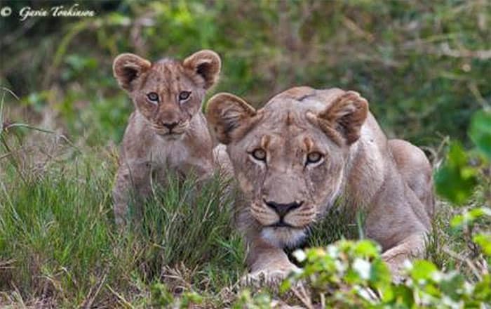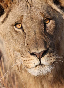 The best build up of excitement was also thanks to the male lions. Late one afternoon we found some lion tracks middle west of the park on a dusty road; by the size of the tracks we knew it was males. It lead us into a big open grassy area where we lost the tracks. After a few minutes of looking around I spotted that massive head in the grass. As we approached the excitement grew … we saw blood.